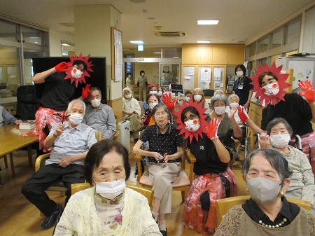 「敬老の日」本日のレクリエーションは敬老会を催しました。ゲームを楽しんだり、歌を歌ったりしました。特別イベントでは職員扮する太陽たちが皆様の長寿をお祝いしました。