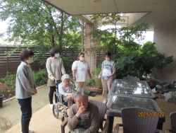 入居者様にも参加していただき、テラスに避難です。