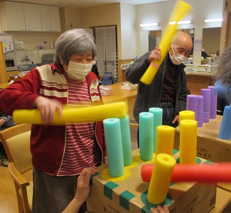 本日のレクリエーションは職員手作りのもぐら叩きもどきゲームをしました。柔らかいスポンジ棒で一生懸命に出っ張りを叩き、引っ込めていました。終わった後は皆息が上がっていましたね。
